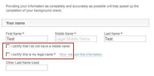 When completing the HireRight background invitation form, you will be required to input your First, Last, and Middle Name. If you do not have a middle name, you will check a field certifying that you do not have a legal middle name. Please make sure you enter your legal name (not nicknames, short names, etc.…).